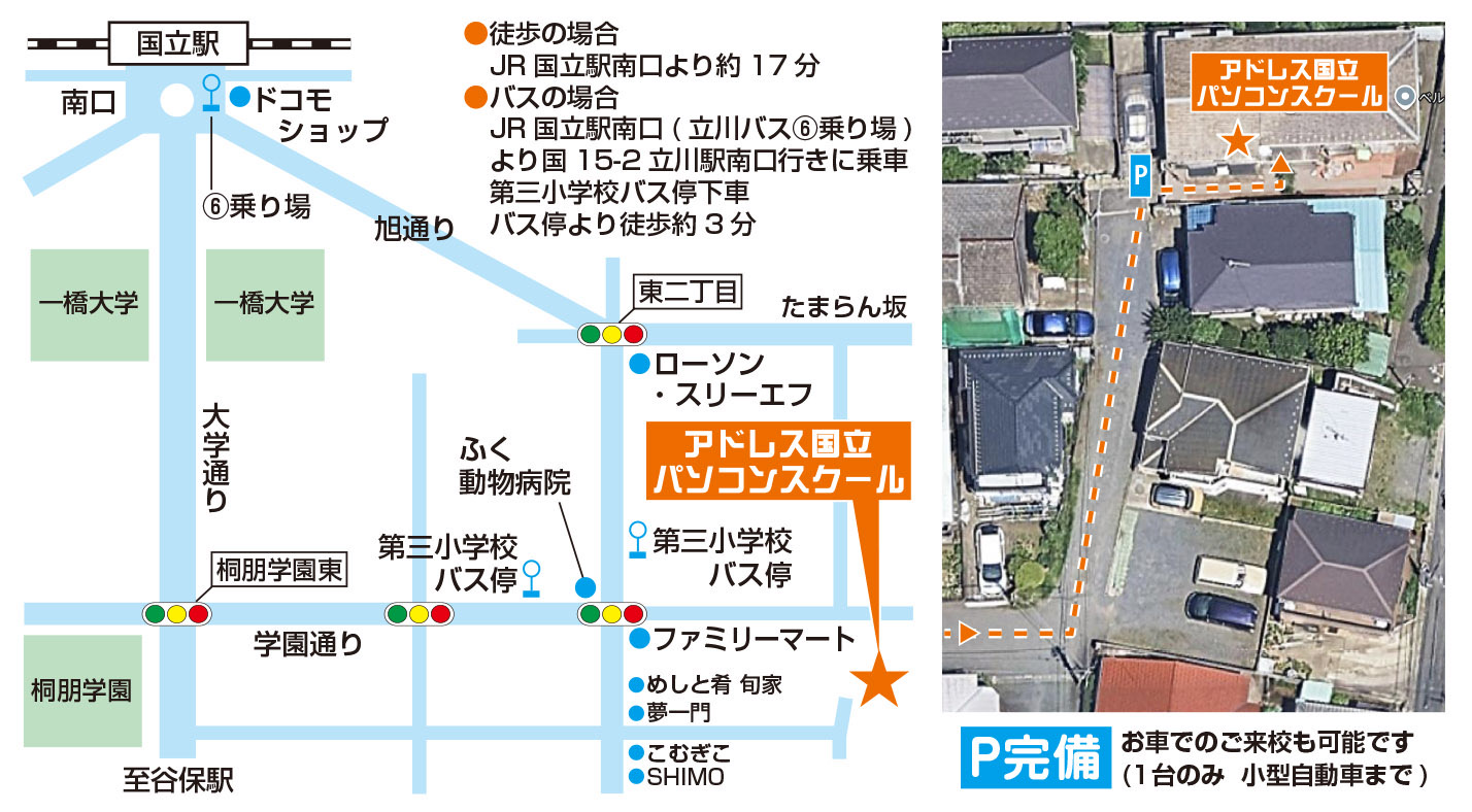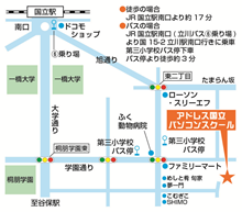 アドレス国立パソコンスクールはJR国立駅南口より旭通りをお進みいただくと徒歩約17分。あるいは駅前6番のバス乗り場からバスで4分。第三小学校バス停下車3分です。